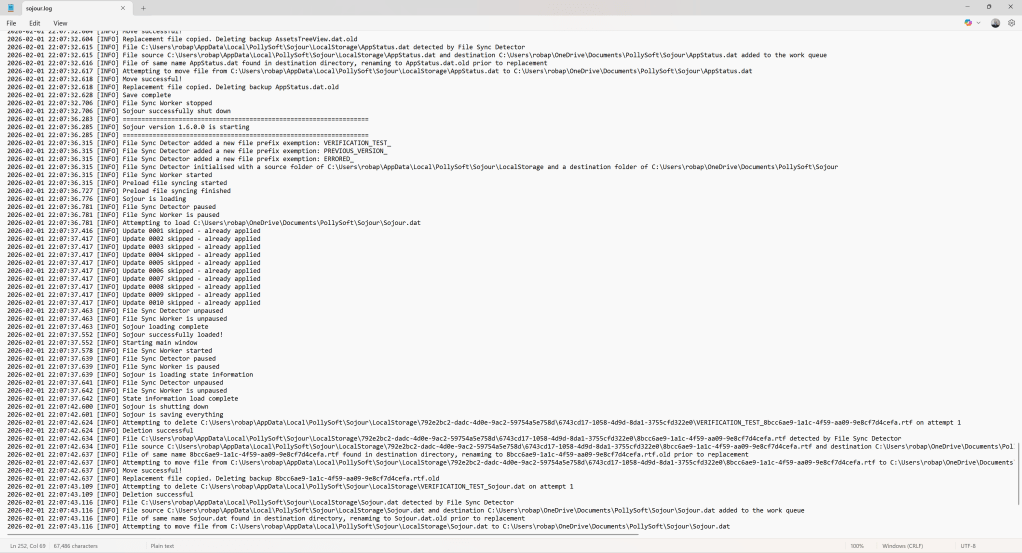 The above log is the standard log, but the system also outputs a much more detailed developers log for when Sojour is run from Visual Studio.