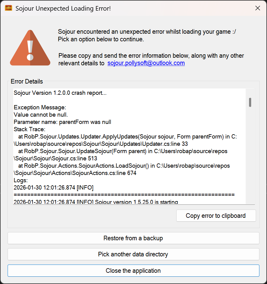 These logs are now included in Sojour’s exception windows if, heaven forbid, Sojour crashes: