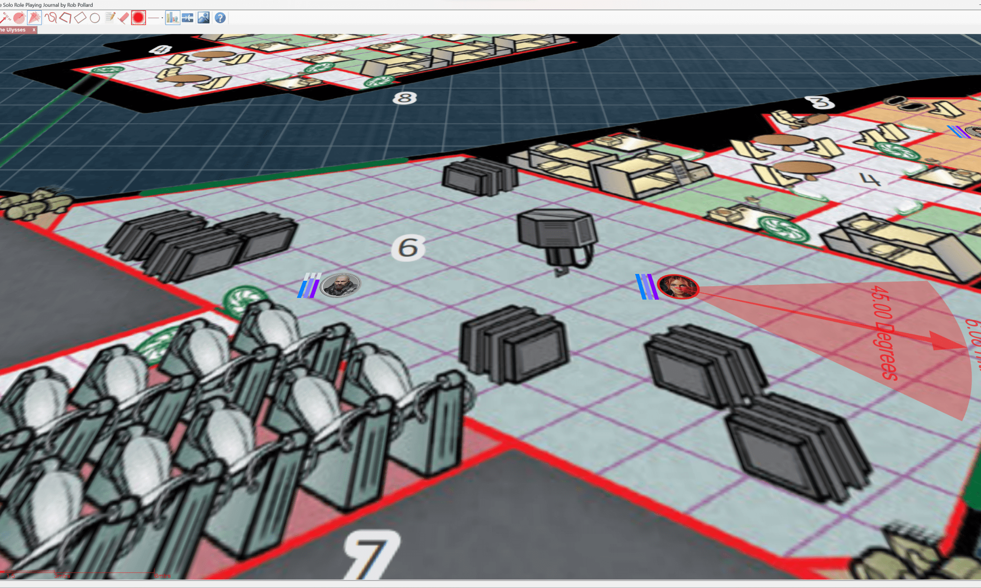 All I did was press a new button to register this 2d starship plan’s drawn plane so that Sojour could then tilt the map to exactly match that plane (one of the advantages of using a 3d engine!). The effect is a much more 3d look and feel for these kind of maps!