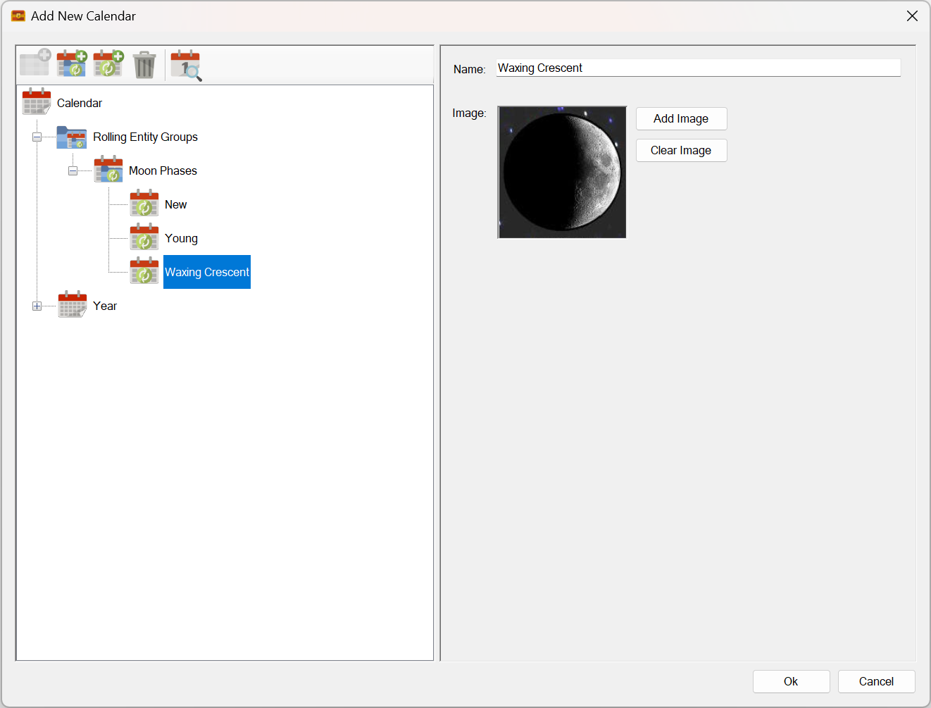 For example you could set the lowest level time units to show the day of the week and the moon-phases together! Both sets of rolling entities will independently roll and display on the calendar!