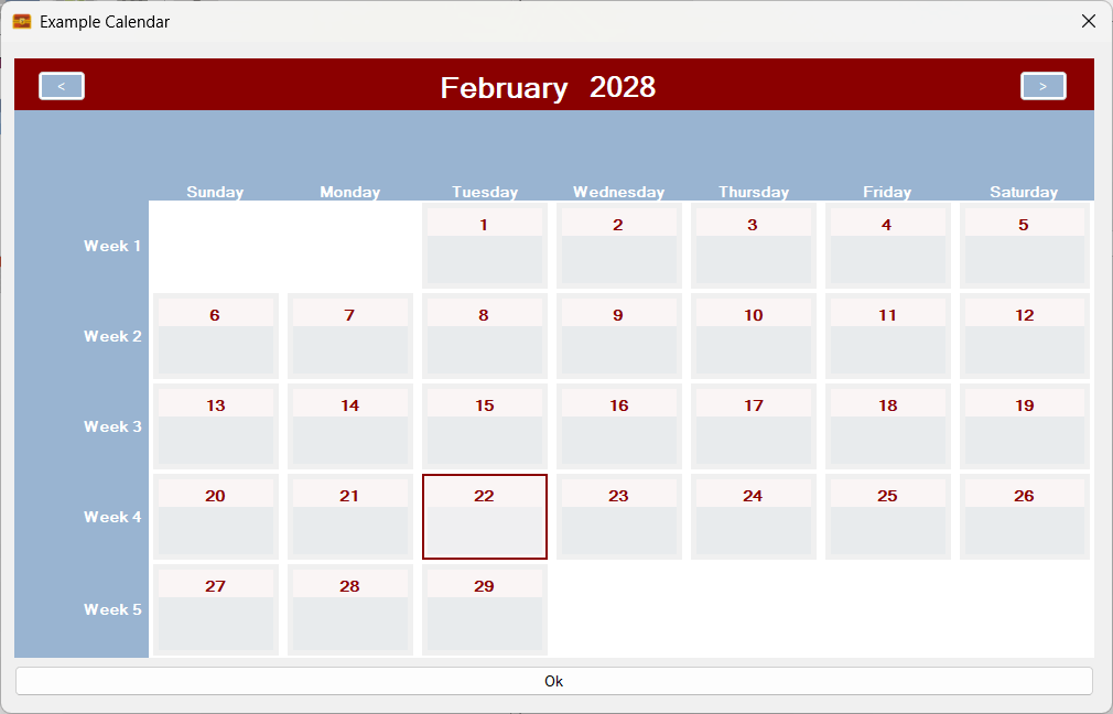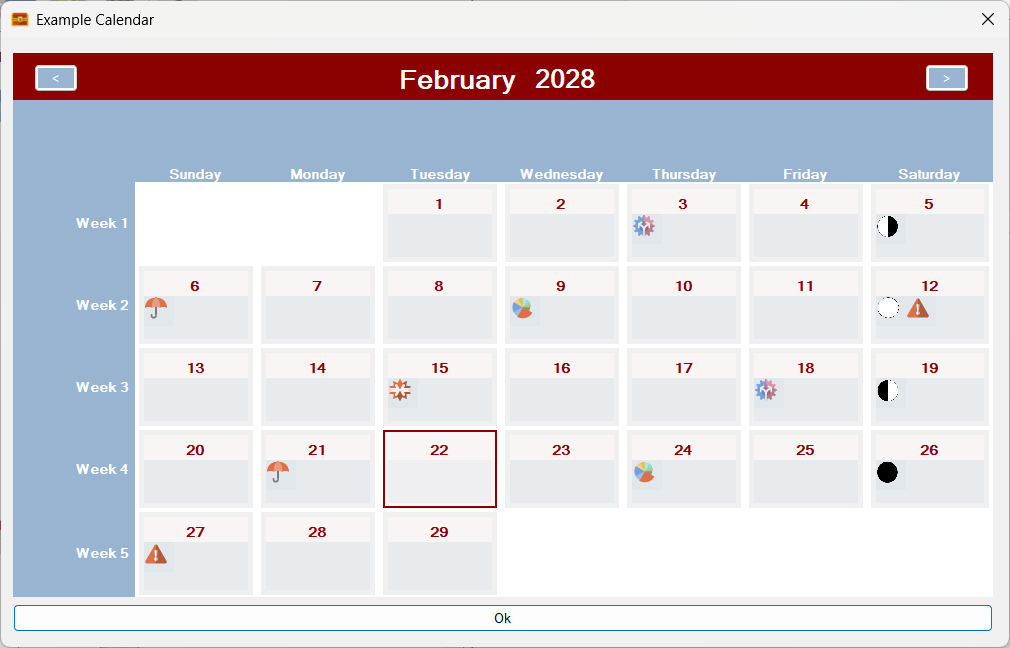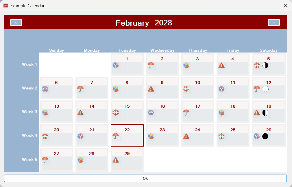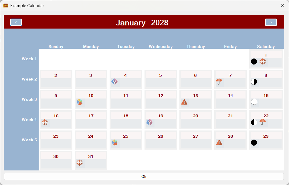 Plus, remember, that the Gregorian calendar that you see in the above examples is created from first principals using time units and rolling entities – no operating system calendar components are used! Sojour’s calendars also go a lot further forward and a lot further backward in time than the Windows calendar too – see this post for more information.