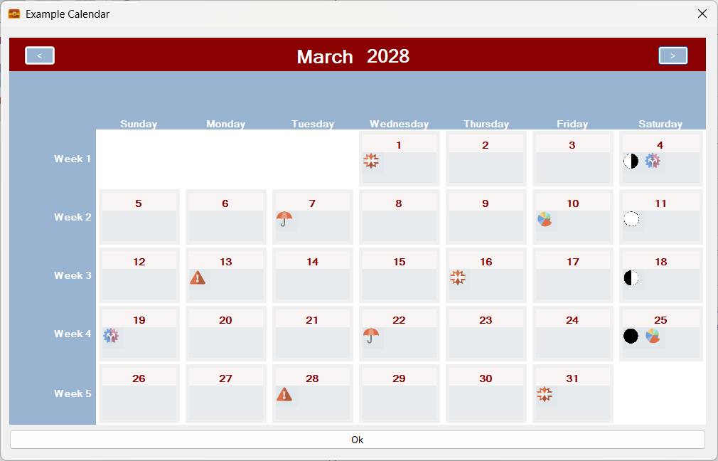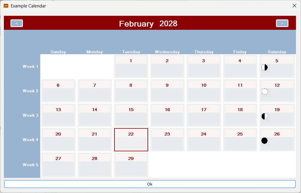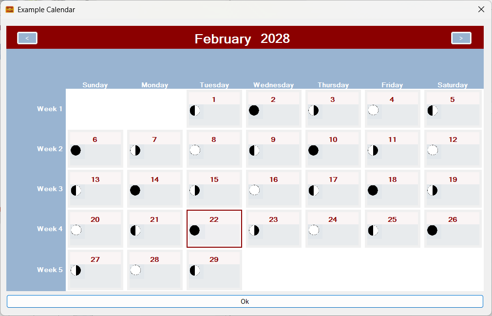 The above functionality will enable people to to add special rolling events in the form of iconography or text to their calendars. This should benefit many RPG calendars. For example the Runequest Gloranthan calendar should show the phases of the Red Moon as that moon directly affects the strength of Lunar magic. This system makes it very easy to add those phases!
