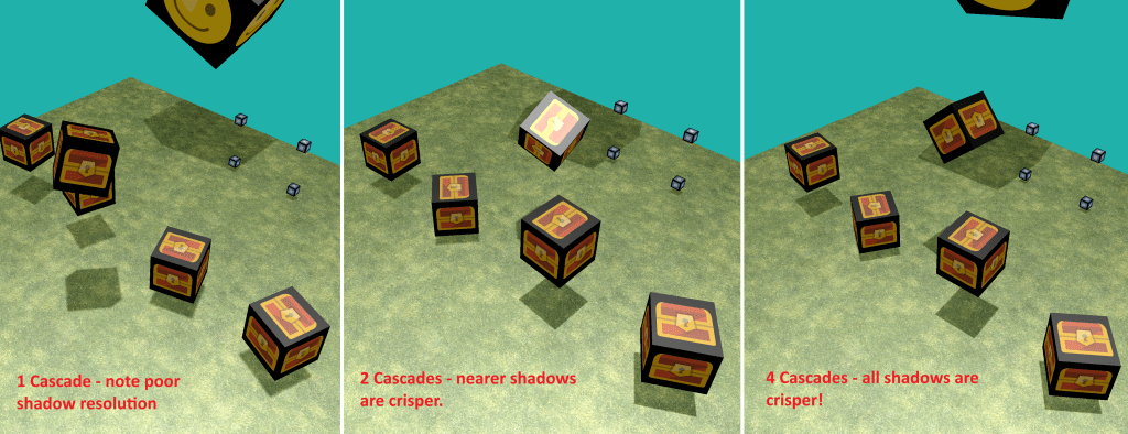 Dorian’s CSM system gets around this by creating multiple depth textures that are range dependent. These are called cascades. Each cascade is responsible for creating shadows over a specific depth range.