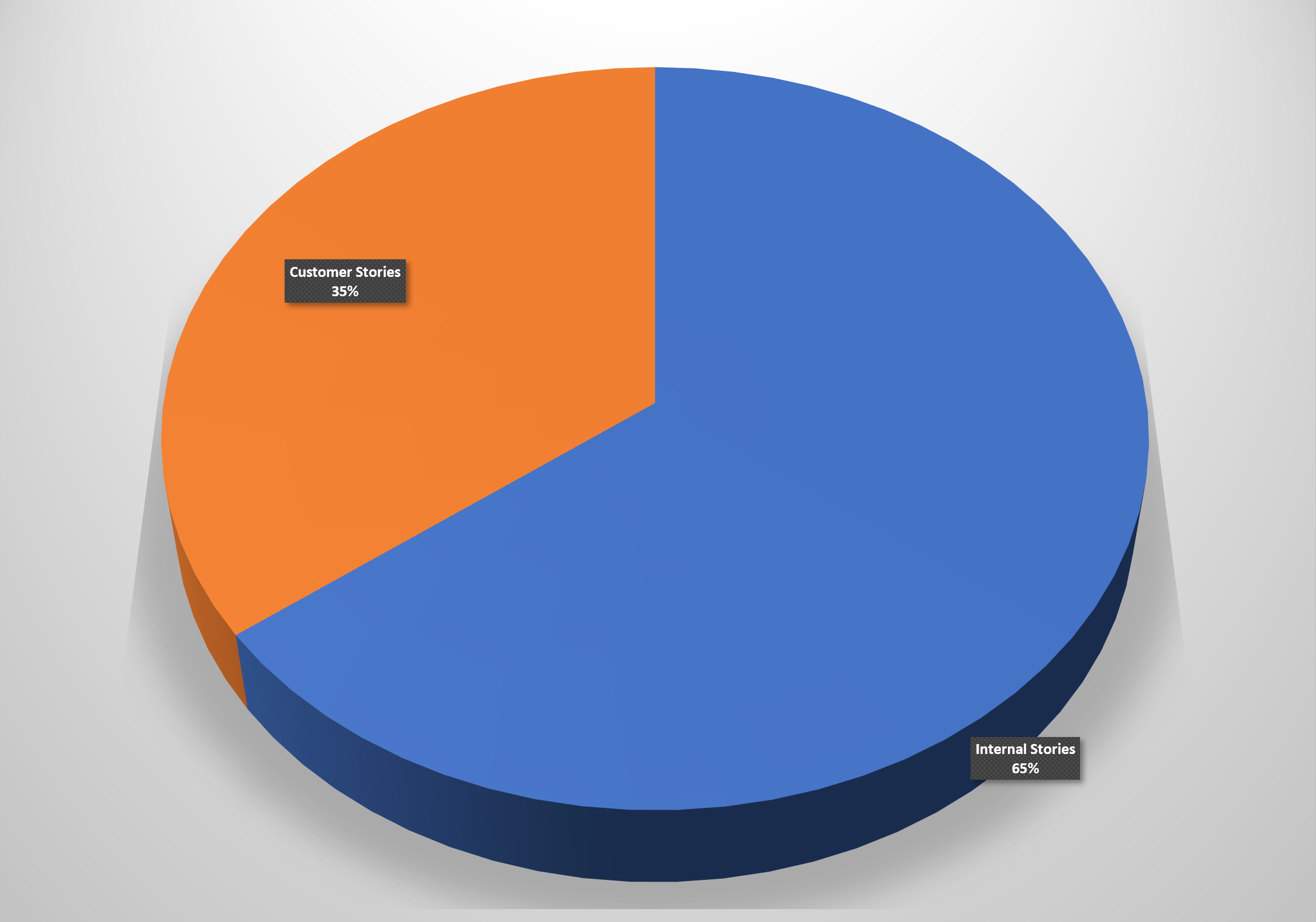 From here we can see that the story breakdown is almost equally divided between 50% bug fixing and 50% new functionality. Note that this chart and the others below are broken down by number of stories and not time. As such they don’t represent effort.
