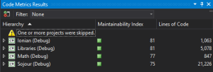 The maintainability index has a range of 7581. This index is a broad indication of code quality. Microsoft suggest anything from 20-100 is good, so I guess Sojour’s scores put it at the higher end – which is good news 🙂