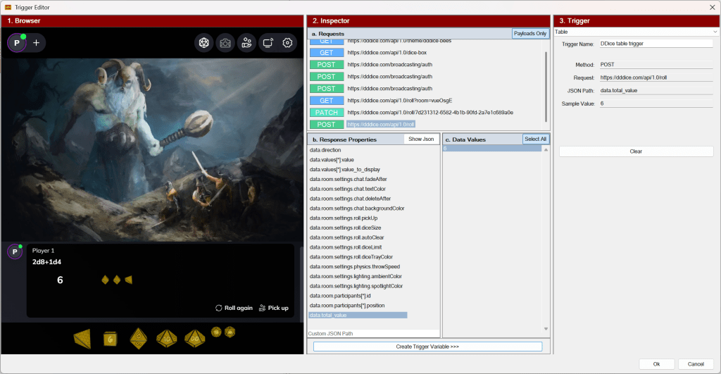 For example, if I wanted to integrate a third party dice roller, say DDDice, I could add a trigger to look out for when a dice is rolled in DDDice: