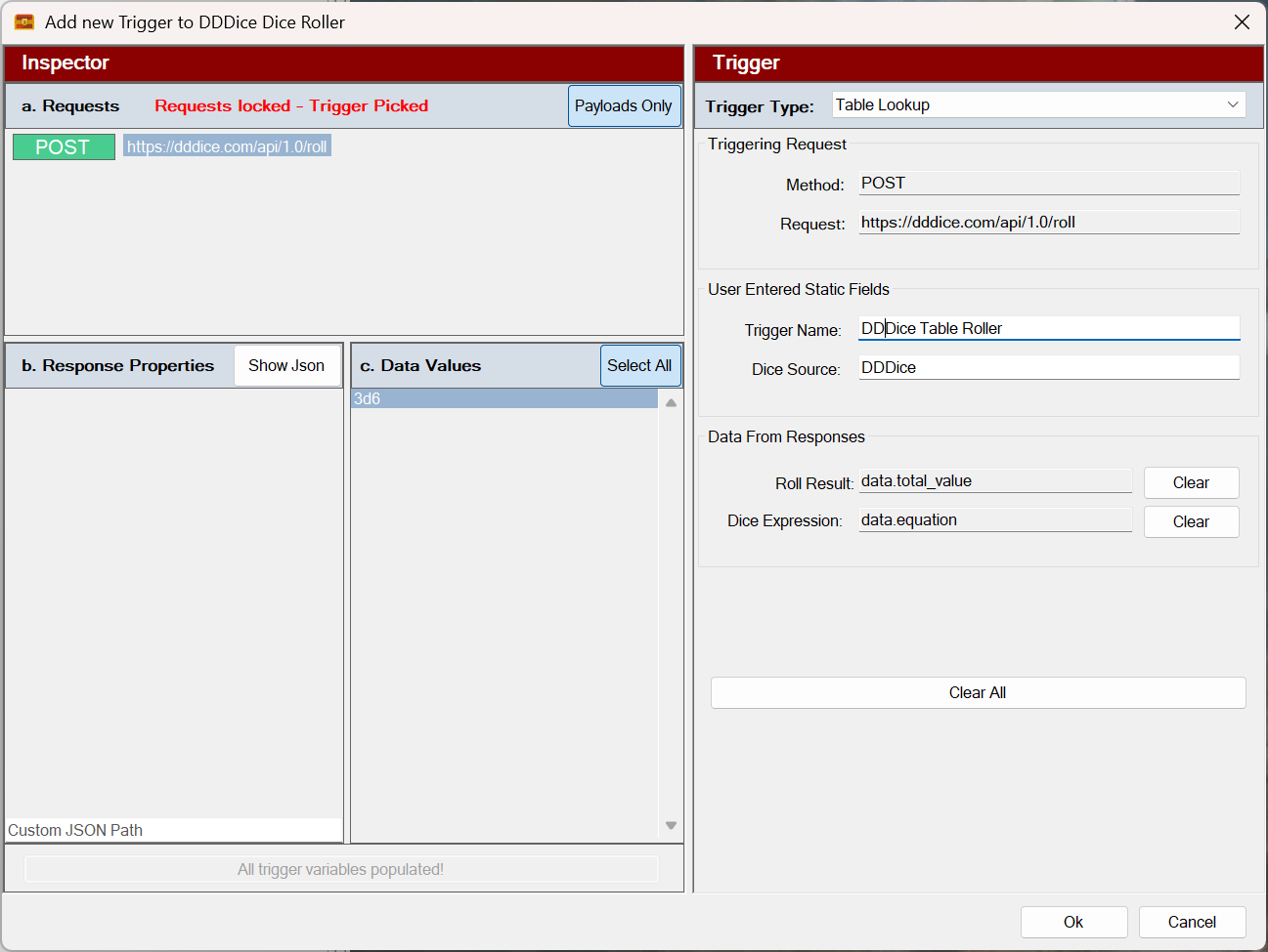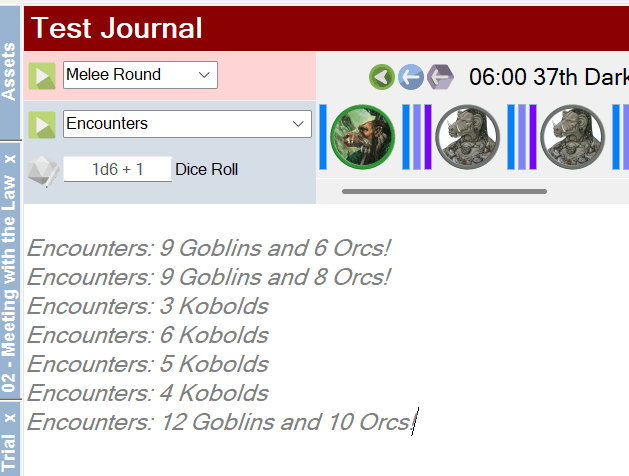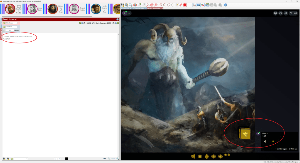 Now that DDDice is wired in, I can roll dice in it and have them trigger table rolls in Sojour automatically!