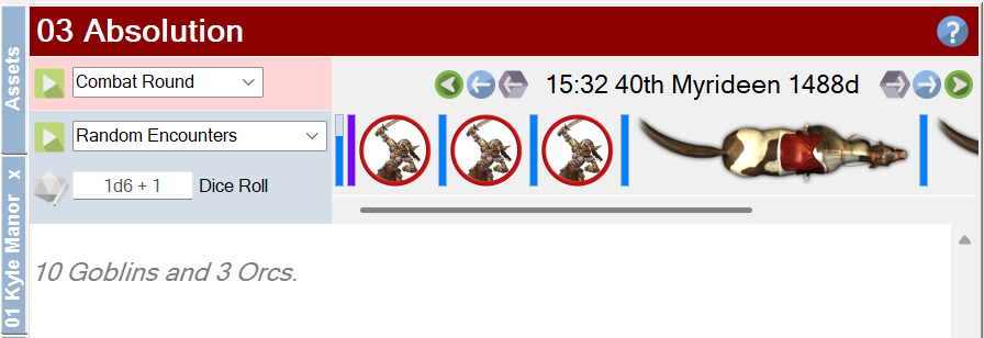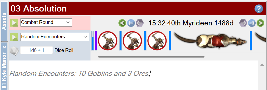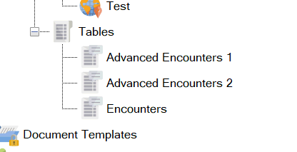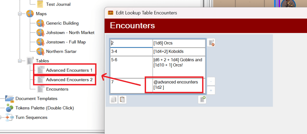 For the above screenshot, if the system (or user) rolls a 7 on the Encounters table, Sojour will then roll a 1d2 dice (an impossible dice in real life, but one that Sojour can roll). The result of this 1d2 dice determines which Advanced Encounters table the Encounters table will refer to.