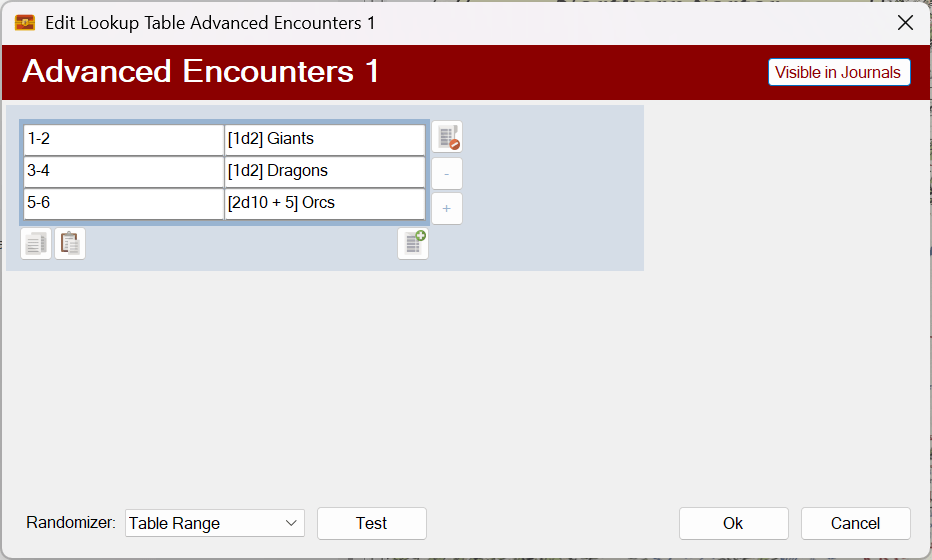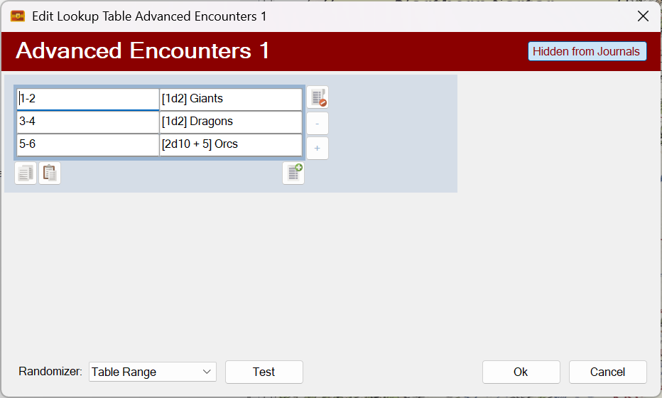 The tables support all four dice expression formats that the journals do (it’s the same code) and you can make those expressions as simple or as complex as you like.