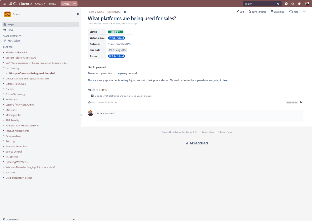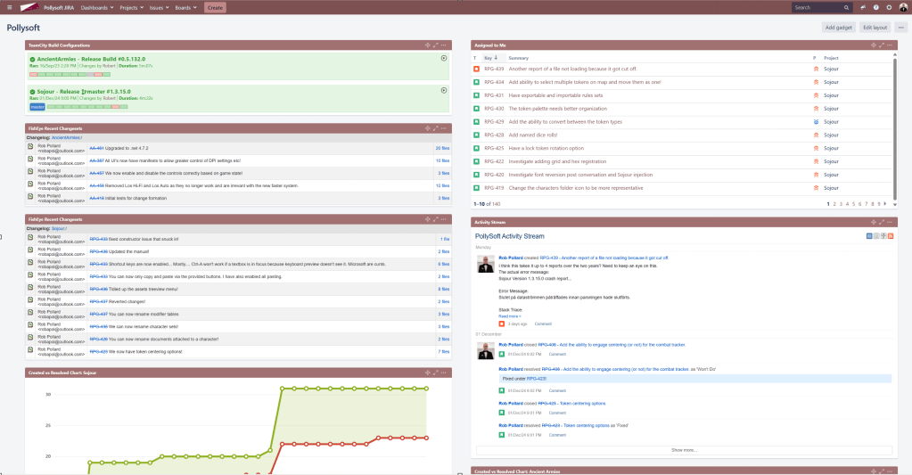 JIRA: Stories and Task Management. This stored all of my stories and tasks. In Sojour’s updates you would have seen these as RPG-XXXXX. These are now all gone and I will discuss the implications later.