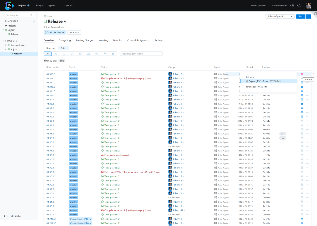 Team City: Automated Builds. This system ran Sojour’s automated builds. It carried out a lot of tasks fully autonomously. These tasks ranged from automatic versioning, running tests, code obfuscation and the production of Sojour’s installers.
